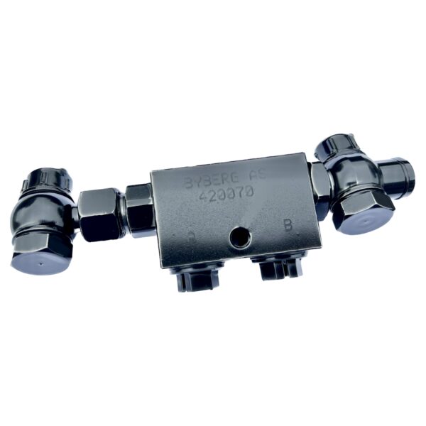 Dette er en såkalt dobbel pilotstyrt tilbakeslagsventil, som bruker to separate piloter for å kontrollere flyten av hydraulikkolje gjennom ventilen.