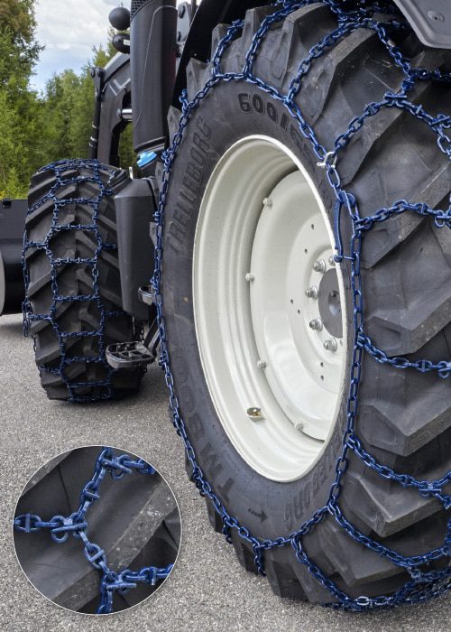 - Unik kjetting for snøbrøyting og kjøring på islagte veier.