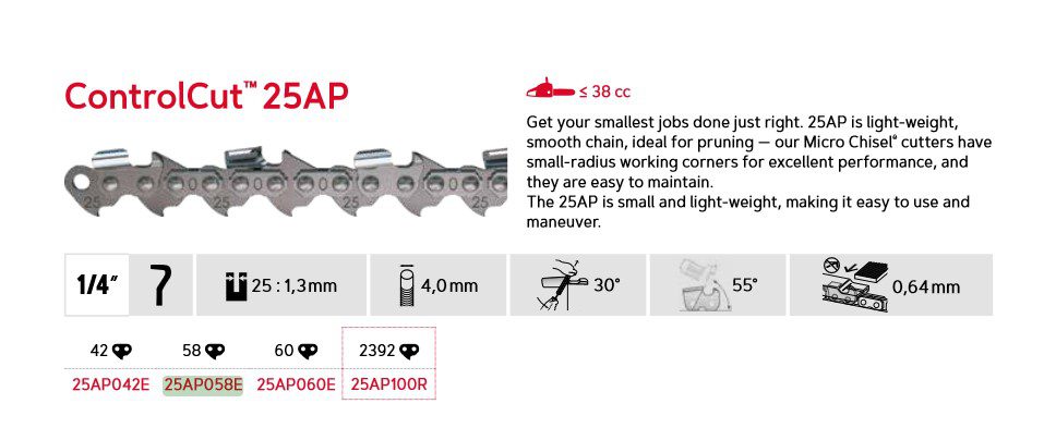 ControlCut™ 25AP er et lett og smidig kjede, ideelt for små jobber som beskjæring. Micro-meisel med små avrundede skjærehjørner gir utmerket ytelse og er lett å vedlikeholde. Dette kjedet er lite og lett, noe som gjør det enkelt å bruke og manøvrere.