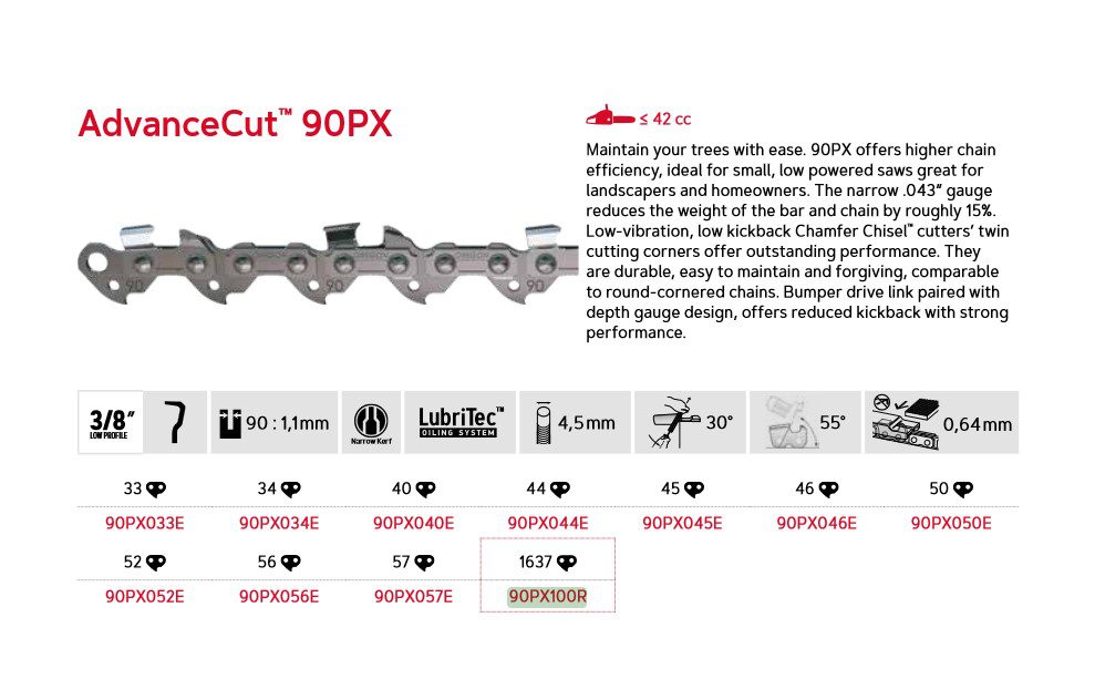 AdvanceCut™ 90PX gjør det enkelt å vedlikeholde trærne dine. Ideell for små, lavkraftige sager, perfekt for gartnere og huseiere. Den smale sporbredden på 1,1 mm (.043″) reduserer vekten med ca. 15%. Lav vibrasjon og lavt tilbakeslag med Chamfer Chisel™-skjær gir utmerket ytelse og er lette å vedlikeholde.