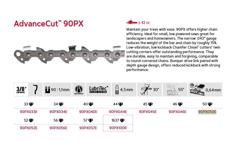 AdvanceCut™ 90PX gjør det enkelt å vedlikeholde trærne dine. Ideell for små, lavkraftige sager, perfekt for gartnere og huseiere. Den smale sporbredden på 1,1 mm (.043″) reduserer vekten med ca. 15%. Lav vibrasjon og lavt tilbakeslag med Chamfer Chisel™-skjær gir utmerket ytelse og er lette å vedlikeholde.