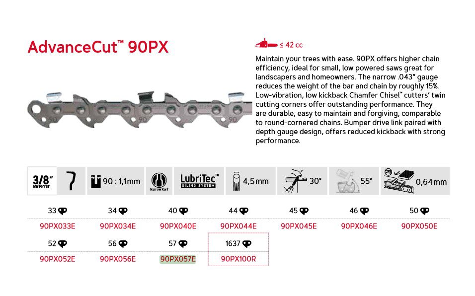 AdvanceCut™ 90PX gjør det enkelt å vedlikeholde trærne dine. Ideell for små, lavkraftige sager, perfekt for gartnere og huseiere. Den smale sporbredden på 1,1 mm (.043″) reduserer vekten med ca. 15%. Lav vibrasjon og lavt tilbakeslag med Chamfer Chisel™-skjær gir utmerket ytelse og er lette å vedlikeholde.