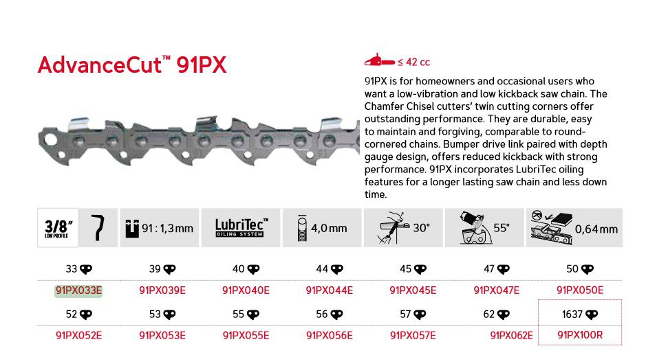 Oregon AdvanceCut™ – 91PX – 3/8″ Low Profile™ – 1,3 mm – 33DL – 8″ – 91PX033E