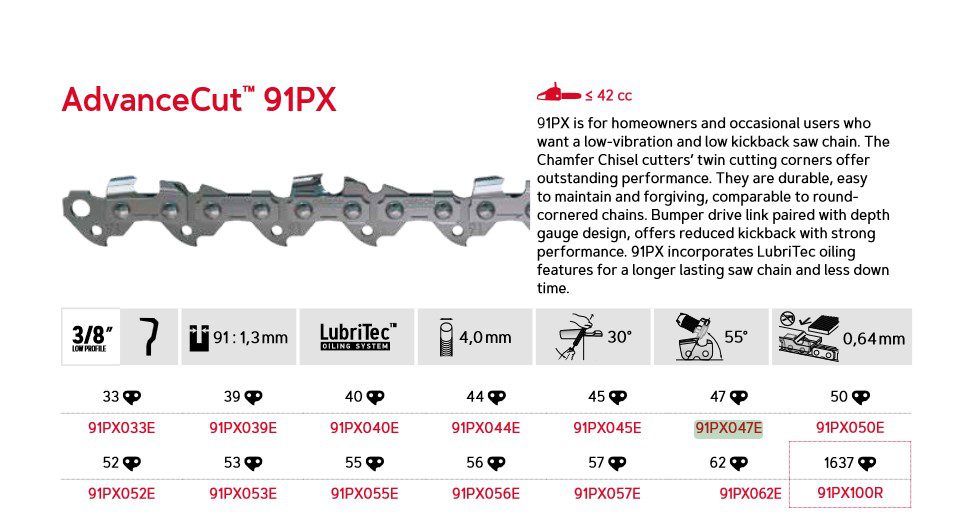 AdvanceCut™ 91PX er for huseiere og hobbybrukere som ønsker et kjede med lav vibrasjon og lavt tilbakeslag. Skjærene har avrundede hjørner, noe som gir utmerket ytelse og er mer tilgivende ved filing. Kjedet er holdbart, lett å vedlikeholde, og mer tilgivende enn kjeder med skarpe hjørner. Drivlenker med sikkerhetsfunksjon kombinert med dybdemål-design gir redusert tilbakeslag og sterk ytelse. LubriTec oljesystem sikrer lengre levetid og mindre nedetid.