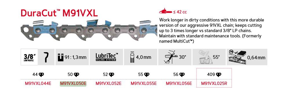 DuraCut™ 91VXL er et høytytende kjede med lav profil. Ideelt for profesjonelle arborister, gartnere og fruktdyrkere som bruker lette motorsager. Lav vibrasjon og semi-meisel-skjær gir en aggressiv skjærekant, tilgivende filing og god holdbarhet. Skjærtoppene er 33% lengre enn standard 91-skjær.