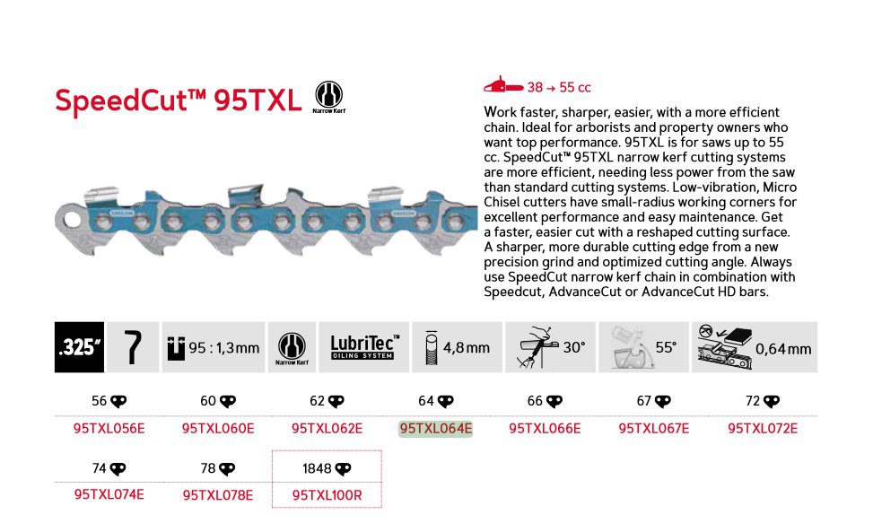 SpeedCut™ 95TXL lar deg jobbe raskere og mer effektivt. Ideell for arborister og hobbybrukere som ønsker topp ytelse. Kjedet er beregnet for sager opptil 55 cc. SpeedCut™ smalspor-kjedesystemer er mer effektive og krever mindre kraft fra sagen enn standard kjeder. Lav vibrasjon og Micro-meisel-skjær med små arbeidskanter gir utmerket ytelse og er lett å vedlikeholde.