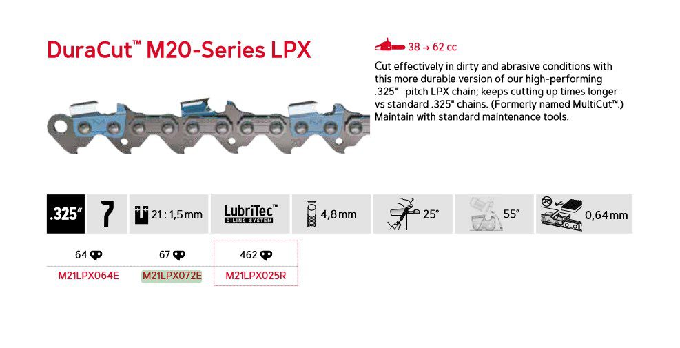 DuraCut™ (MultiCut™) 21LPX kutter effektivt i skitne og krevende forhold med denne mer holdbare versjonen av vårt høytytende .325″ LPX-kjede. Beholder skjæreevnen lenger enn standard .325″-kjeder. Vedlikeholdes med vanlige verktøy.