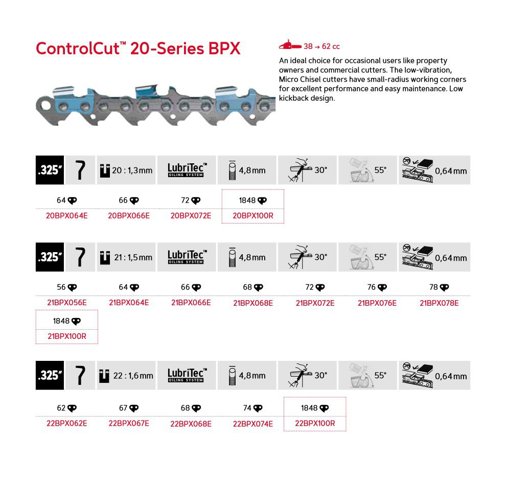 ControlCut™ 22BPX er et ideelt valg for hobby brukere, som til bruk i hagen og for kommersielle kuttere. Lav vibrasjon og Micro-meisel med små avrundede skjærehjørner gir utmerket ytelse og enkel vedlikehold. Lavt tilbakeslag for økt sikkerhet.