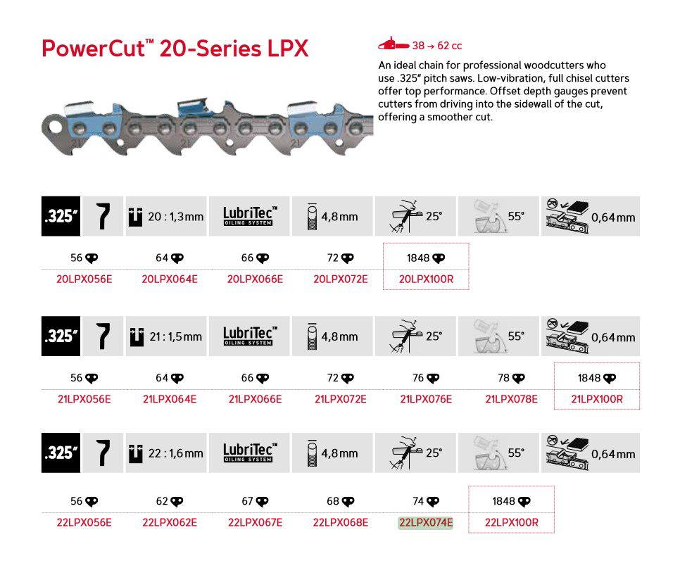 PowerCut™ 22LPX er et ideelt kjede for profesjonelle skogsarbeidere som bruker sager med .325″ deling. Lav vibrasjon og fullmeisel gir topp ytelse, mens offset dybdemål sikrer jevnere skjæring uten at skjærene skjærer inn i sidene.
