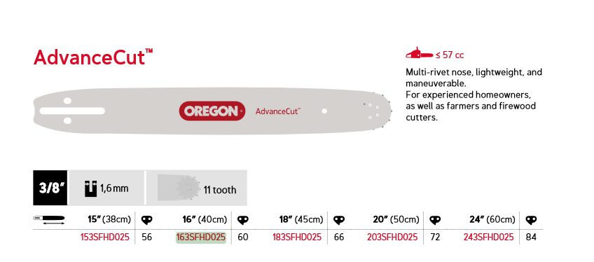 Oregon AdvanceCut™ motorsagsverd er ideelt for trefellere som bruker små til mellomstore motorsager. Dette sverdet er utviklet for å levere høy ytelse, slitestyrke og kontroll under krevende forhold.