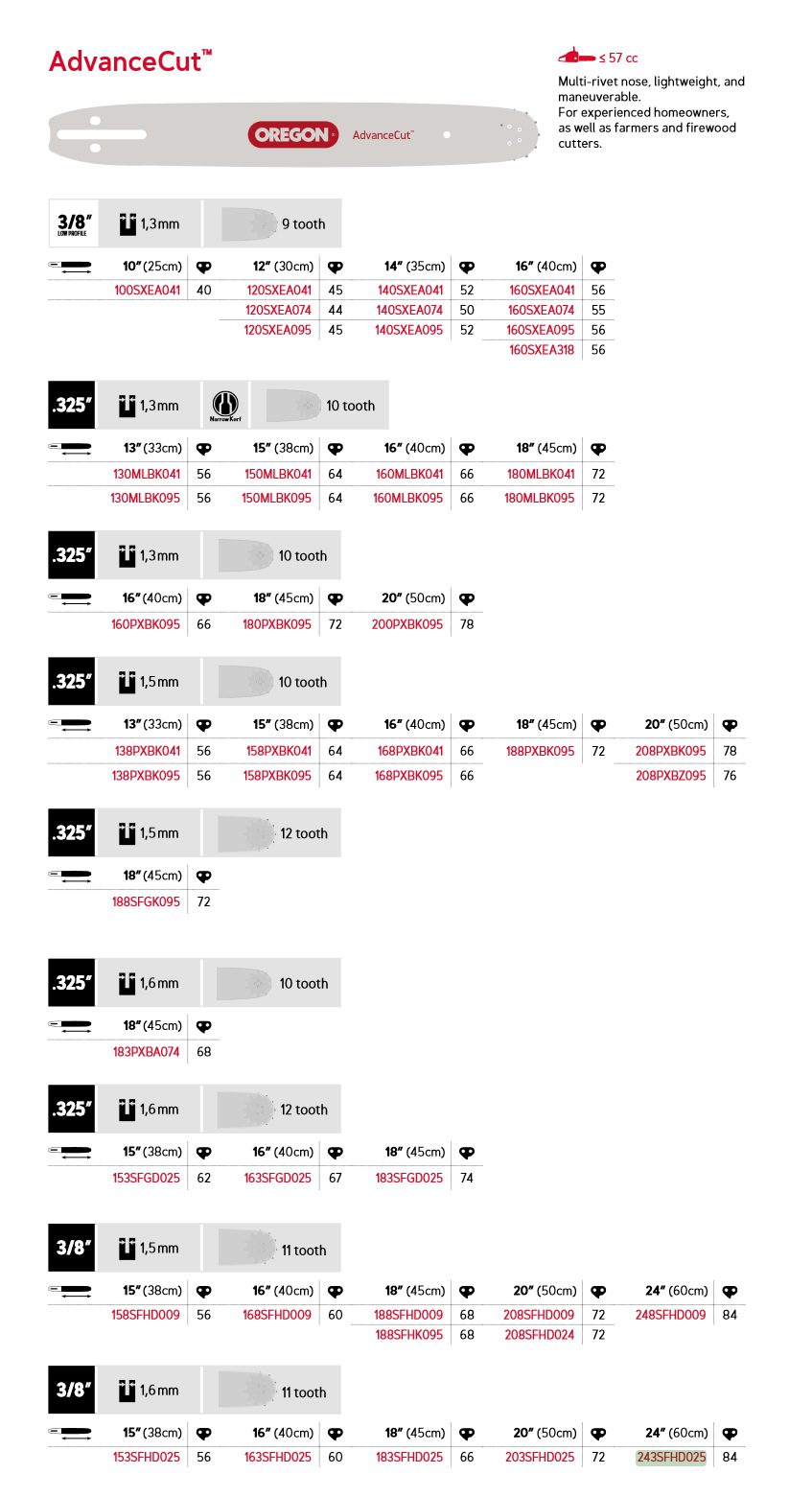 Oregon AdvanceCut™ – SFH – 3/8″ – 84DL – 1,6 mm – 24″ – 243SFHD025