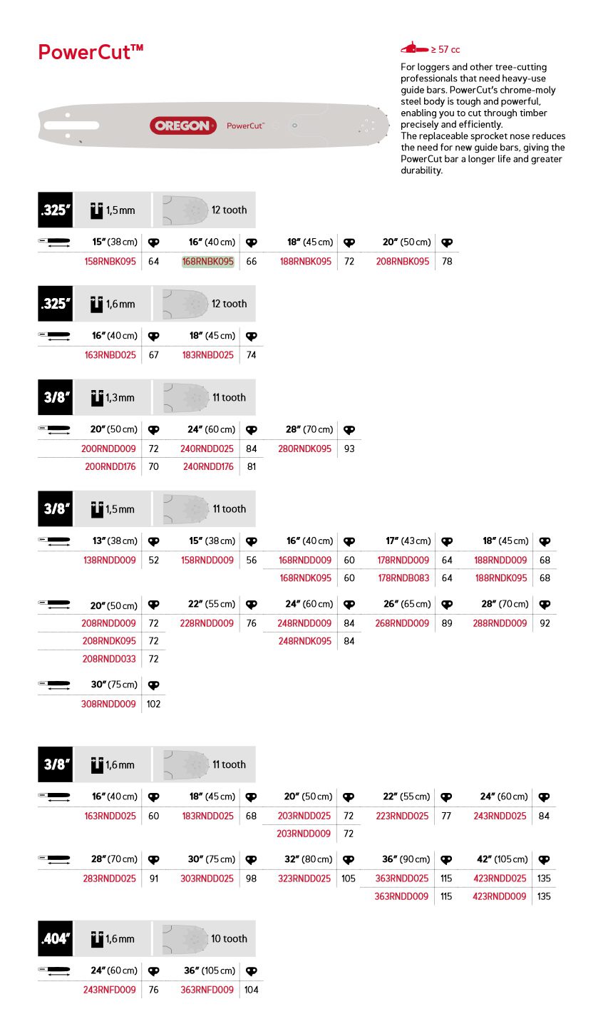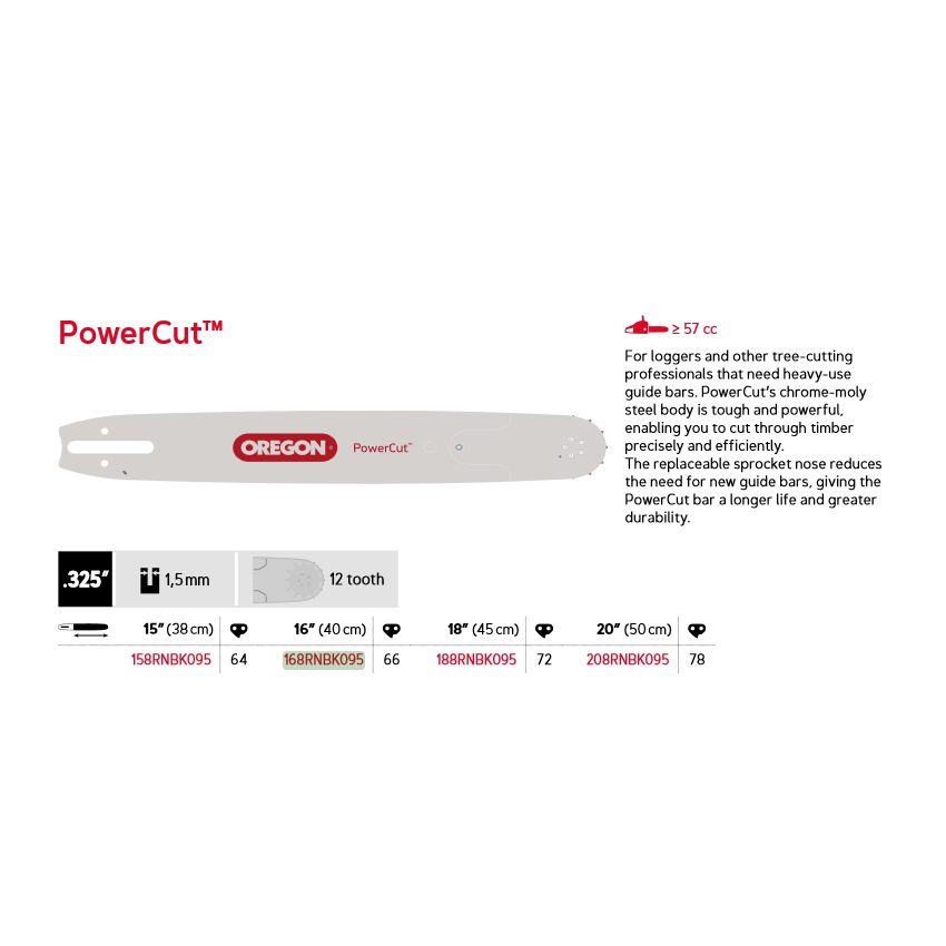 Oregon PowerCut™ motorsagsverd er laget med en solid kropp, spesielt for profesjonelle brukere som benytter kraftige motorsager. Sverdet har en utskiftbar nese, som gjør det mulig å bytte kun denne delen uten å måtte kjøpe et nytt sverd, noe som gir økt kostnadseffektivitet.